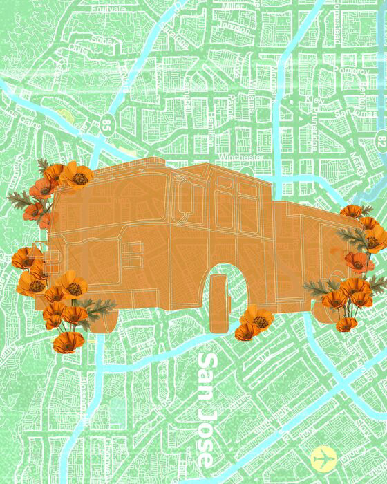 Through meticulous craftsmanship using a combination of Adobe Illustrator and Photoshop, Cortez intertwines elements of the city's map, representing its foundation and emotional fortitude, with the iconic image of a firetruck, a beacon of hope and unity during emergencies. Surrounding this central motif are poppy flowers, evoking beauty flourishing amidst hardship and serving as a testament to the indomitable spirit of San José residents. 'Harmony in Crisis' stands as a poignant reminder of the community's unwavering determination and resilience in navigating turbulent times.